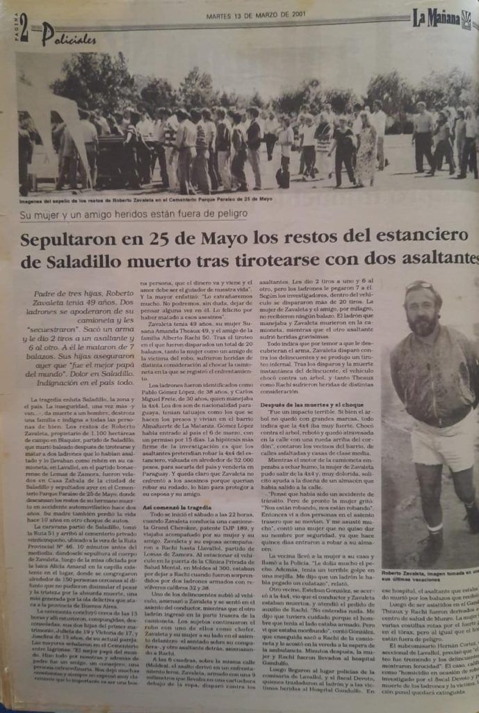Roberto Zavaleta no era de Saladillo, era parte de la historia de Saladillo. Su familia se había radicado en la zona a principios del siglo XX y era un estanciero muy apreciado. Le gustaban la aeronáutica, el surf, el automovilismo, las armas. Tenía unas 1.100 hectáreas de campo en Juan José Blaquier, a 40 kilómetros de Saladillo, y 49 años. Murió lejos de sus pagos, en Llavallol, partido de Lomas de Zamora, en un atroz tiroteo en el que fallecieron también dos delincuentes que lo habían secuestrado y que dejó heridos a un amigo y a la esposa de Zavaleta. Fue un sangriento sábado de marzo de 2001, que aún perdura en la memoria de los saladillenses.