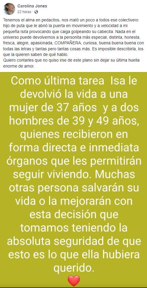 “Tenemos el alma en pedacitos, nos mató un poco a todos ese colectivero hijo de puta que le abrió la puerta en movimiento y a velocidad a mi pequeña Isita provocando que caiga golpeando su cabecita”, indicó Jones, y añadió: “Nada en el universo puede devolvernos a la personita más especial, distinta, honesta, fresca, alegre, apasionada, compañera, curiosa, buena buena buena con todas las letras y tantas pero tantas cosas más. Es imposible describirla, los que la quieren saben de qué hablo”.