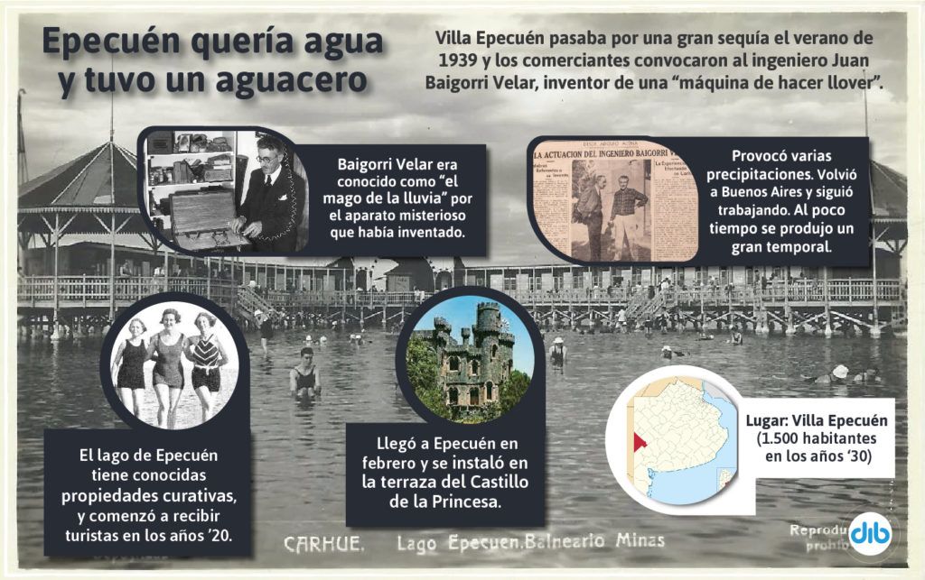 El balneario de Epecuén, en el partido bonaerense de Adolfo Alsina, es muy conocido por las aguas curativas de su laguna, que le dieron fama a lo largo de muchas décadas, y por la inundación de 1985 que sumergió la villa y la destruyó por completo. Pero entre las muchas historias que atesoran sus aguas salobres hay una que parece nacida de la mente de un escritor de ciencia ficción: la llegada a Epecuén del ingeniero Juan Baigorri Velar y su máquina de hacer llover. El inventor cambiaría la suerte del verano de 1939 en la villa balnearia y sería recordado con asombro.