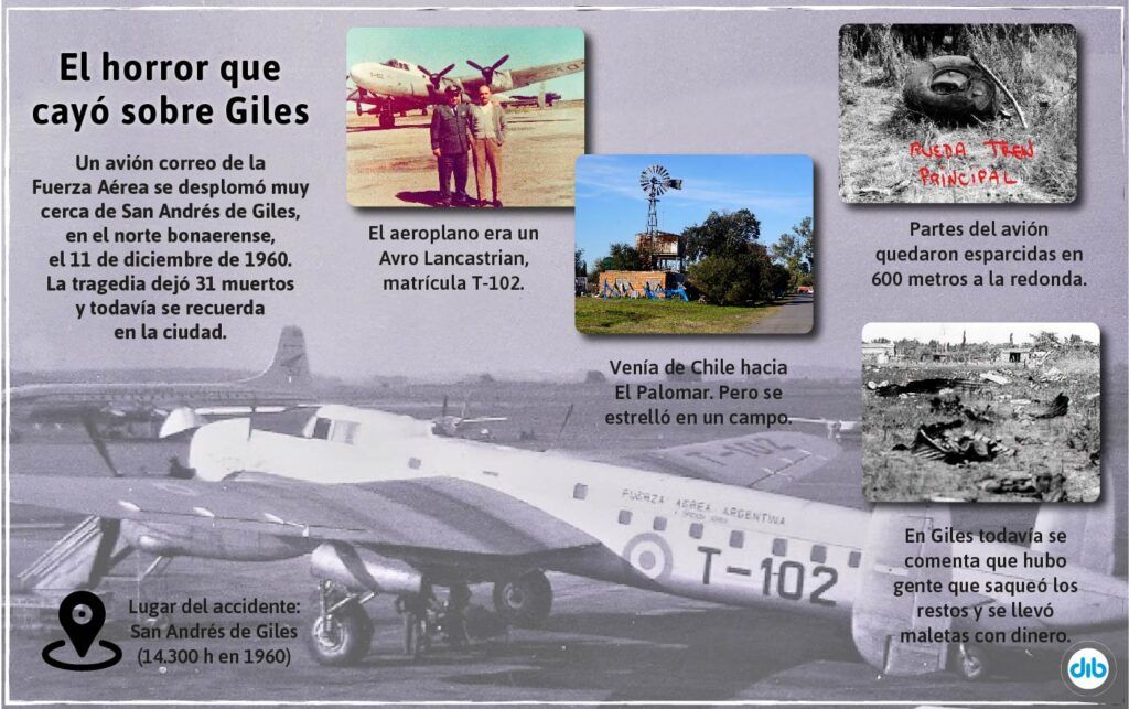El 11 de diciembre de 1960 fue domingo, día pintado de rojo en el almanaque, pero en el recuerdo de los bonaerenses su color fue rojo sangre. Porque mientras en San Justo morían 13 espectadores del Gran Premio del TC, en San Andrés de Giles se estrellaba un avión de la Fuerza Aérea Argentina con un saldo de 31 víctimas fatales, uno de los peores accidentes en la historia del ejército del aire nacional. La tapa del diario Clarín del día siguiente destacó que el avión “cayó y estalló, como una granada siniestra, cerca de San Andrés de Giles. Treinta y una personas viajaban en la máquina que se deshizo como polvo”. En la ciudad todavía hay mucha gente que recuerda el terrible accidente. Afirman que quedaron impresionados por la visión de los cuerpos destrozados y, además, aseguran que mucha gente se apropió de dinero y objetos que venían en el aeroplano y que quedaron esparcidos en el campo donde se desplomó, en el kilómetro 99 de la Ruta 7. Pero esto último parece estar más cerca de la leyenda oscura que de la desgarradora realidad del incidente.
