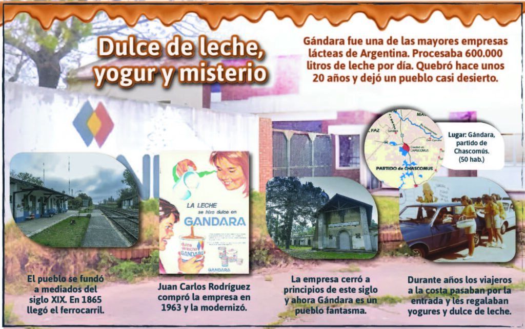 Salir hacia Mar del Plata, tomar la Ruta 2, antes de Chascomús doblar hacia la derecha, recibir muestras de yogurt y dulce de leche, volver, tomar agua mineral gratis, seguir hacia la Costa Atlántica. Esta secuencia está grabada en la memoria de mucha gente y se repitió durante décadas mientras existió en el pueblo de Gándara la empresa lechera homónima. Pero veinte años atrás la firma, que en su momento cumbre procesaba 600.000 litros de leche por día, cerró y la localidad comenzó a afantasmarse. Así, Gándara se ha transformado en una “población rural dispersa” en la que viven en la zona unas 50 personas. El convento, los locales, la planta láctea: todo está abandonado. Solo recorren el pueblo turistas atraídos por el espectáculo singular de las calles solitarias. ¿Qué pasó para que una localidad tan próspera terminara en la penumbra?