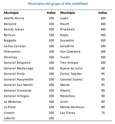 Los que arribaron a la excelencia son Adolfo Alsina, Balcarce, Benito Juárez, Berisso, Bragado, Carlos Casares, Chascomús, Chivilcoy, General Belgrano, General Madariaga, General Pinto, General Pueyrredón, General San Martín, General Viamonte, General Villegas, La Matanza, La Plata, Lincoln, Lobería, Luján, Rauch, Rivadavia, Rojas, Saavedra, Saladillo, San Cayetano, Tandil y Tres Arroyos.