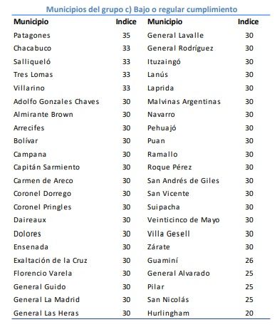 En el segundo grupo, de “rango medio”, hay unos 25 municipios. Se trata de comunas que “en líneas generales presentan el Presupuesto 2023 y la Situación Económico Financiera a diciembre de 2022”, pero que “muestran un menor nivel de información publicada y de cumplimiento de plazos requeridos por las normas”. Entre estos se encuentran municipios como Magdalena (73), Ayacucho (70), Olavarría (70), Trenque Lauquen (70), Pinamar (66), San Antonio de Areco (65), Bahía Blanca (63), Avellaneda (60), Berazategui (60), Florentino Ameghino (59), Azul (50) y Lobos (43).