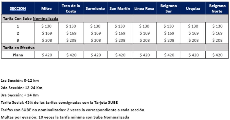 En el caso de los trenes, el uso de tarjetas SUBE sin nominalizar implicará pagar el doble de tarifa. Y las multas por evadir el pago del pasaje serán de 10 veces la tarifa máxima, es decir $2.080 en total. También se mantendrá la tarifa social, que paga el 45% del precio.