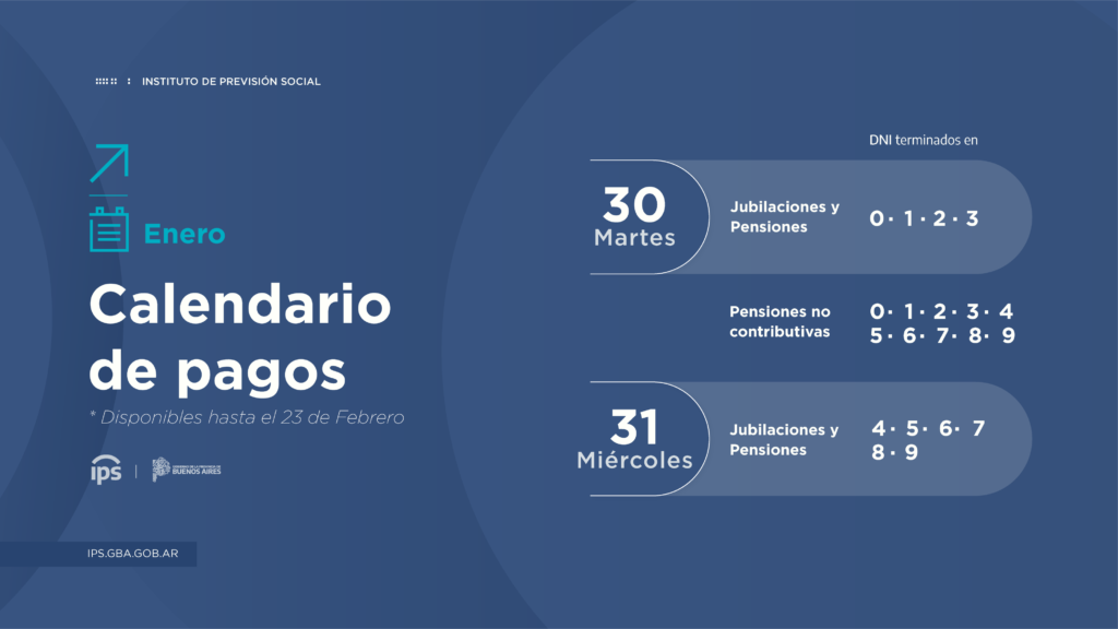En tanto, el miércoles 31 de enero percibirán sus haberes las jubilaciones y pensiones con DNI terminados en 4, 5, 6, 7, 8 y 9.
