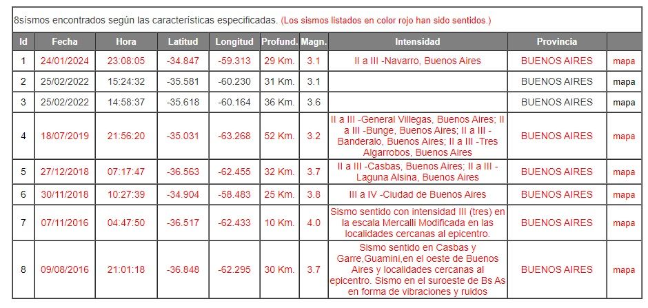 En la provincia de Buenos Aires, antes del sismo de este 24 de enero, en los registros figuran un par de sismos el 25 de febrero de 2022 -no hay reportes de que hayan sido percibidos en la superficie-, y antes, otro el 18 de julio de 2019. Y Pérez suma los últimos que tuvieron mayor repercusión: “Por ejemplo, en 2016 cerca de Guaminí. Y un poco más acá, hubo otro sismo que fue bastante conocido porque generó alarma en la Ciudad de Buenos Aires durante la Cumbre del G-20”. Ese sismo del 30 de noviembre de 2018 tuvo se epicentro 32 kilómetros al sur de CABA, a una profundidad de 25 kilómetros y 3.8 de magnitud.