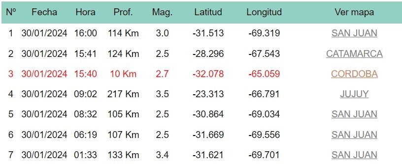 El de la semana pasada se produjo el miércoles 24, a las 23:08:05, latitud -34.847, longitud -59.313, a una profundidad de 29 kilómetros, una magnitud de 3.1, intensidad de II a III. Fue a 24 kilómetros al sureste de Mercedes; a 35 kilómetros al suroeste de Luján; a 67 kilómetros al este de Chivilcoy.