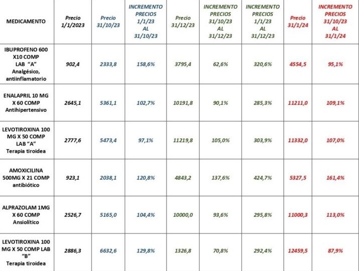 Además, durante 2023 los medicamentos incrementaron sus precios un 319,1%, en particular por los fuertes aumentos verificados en los dos últimos meses del año. Este valor está muy por encima de la inflación acumulada anual de 2023, que fue del 211,4%.