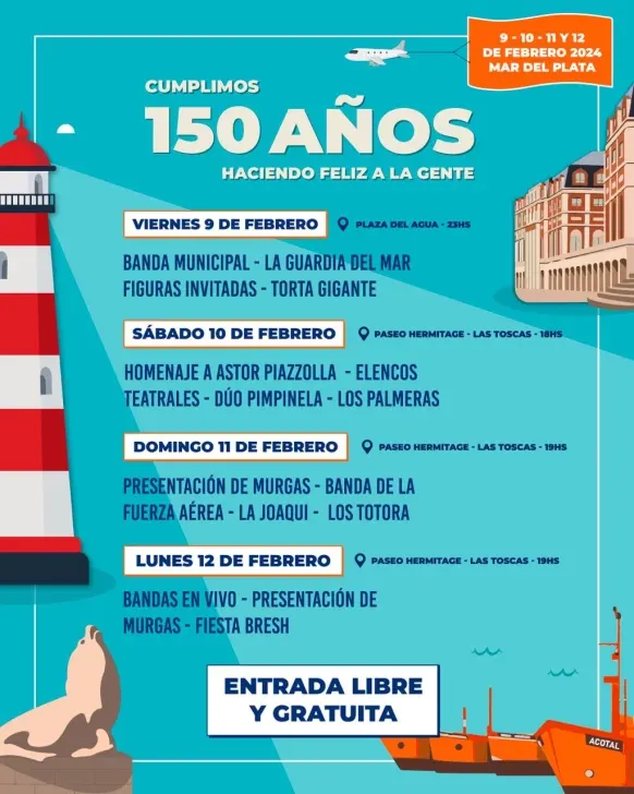 A tres días del aniversario por los 150 años, la ciudad de Mar del Plata celebrará el 10 de febrero, con una serie de actividades programadas que incluirán fiestas, recitales gratuitos de artistas como La Joaqui, Los Totora y Los Palmeras, desfiles náuticos, murgas y atractivos gastronómicos como una torta de 150 kilos y helados con forma de lobo marino.