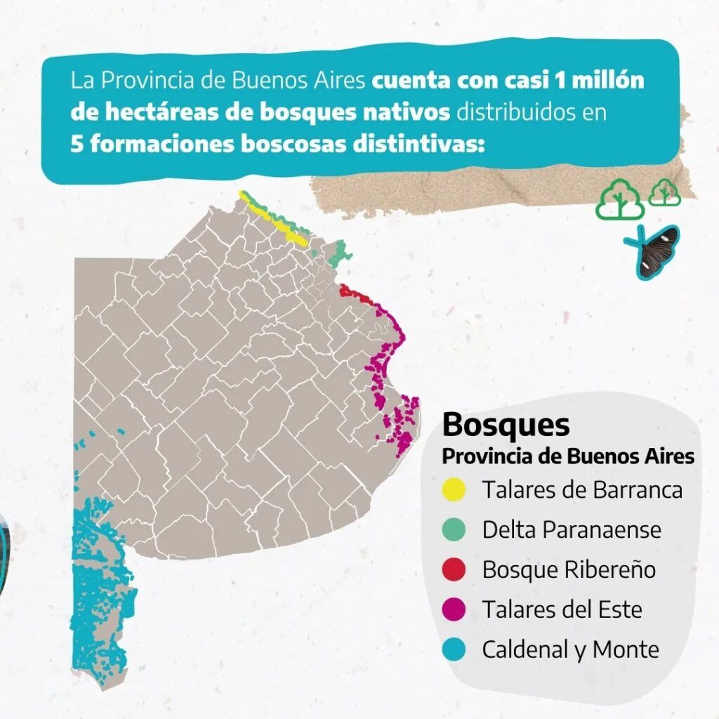 La provincia de Buenos Aires cuenta a lo largo y ancho de su territorio con 969.752 hectáreas de bosques nativos distribuidos en cinco tipos: caldenal y monte, talares de barranca, talares del este, delta y bosques ribereños.