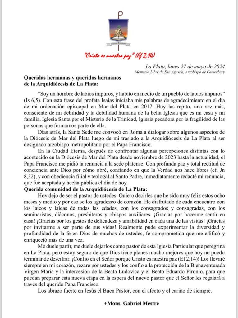 “Días atrás, la Santa Sede me convocó en Roma a dialogar sobre algunos aspectos de la Diócesis de Mar del Plata luego de mi traslado a la Arquidiócesis de La Plata al ser designado arzobispo metropolitano por el Papa Francisco. En la Ciudad Eterna, después de confrontar algunas percepciones distintas con lo acontecido en la Diócesis de Mar del Plata desde noviembre de 2023 hasta la actualidad, el Papa Francisco me pidió la renuncia a la sede platense”, dice el arzobispo en un tramo de la carta dirigida a los platenses.