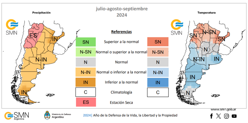 Así, respecto a este pronóstico de consenso y en condiciones neutras del Fenómeno El Niño Oscilación del Sur (ENOS), las precipitaciones serán igual o inferiores a lo normal en casi todo en territorio nacional; inferiores a lo normal en Santa Cruz, Tierra del Fuego, Corrientes, Misiones, y parte de Formosa, Chaco y Santa Fe; y tendrán una estación seca las provincias de San Juan, La Rioja, Catamarca, Tucumán Salta y Jujuy.