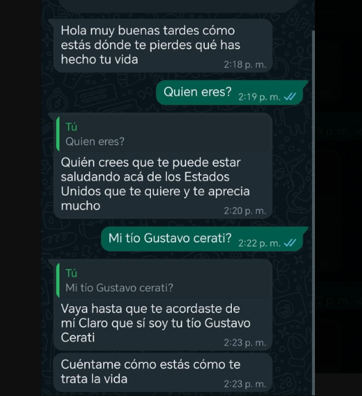“Vaya que hasta te acordaste de mí. Claro que sí soy tu tío Gustavo Cerati. Cuéntame cómo estás cómo te trata la vida”, añadió el delincuente.