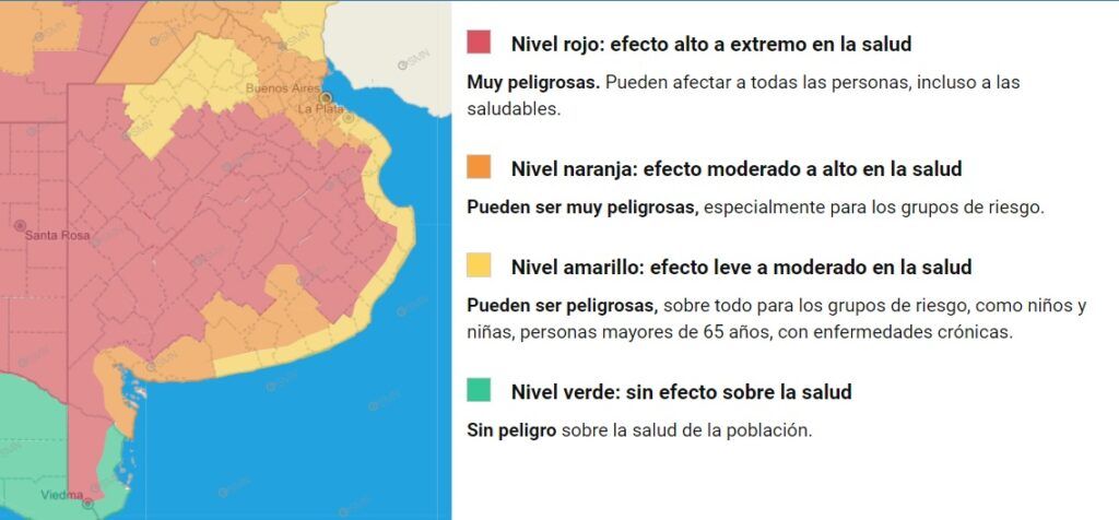 El nivel de alerta más peligroso se mantiene para algunas localidades del conurbano bonaerense y casi todo interior de la provincia de Buenos Aires. La advertencia también alcanza a varias localidades de Córdoba, San Luis, La Pampa, Mendoza y San Juan.