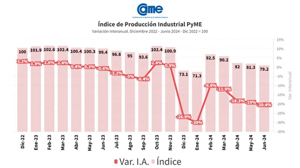 La actividad manufacturera de las empresas pymes cayó otro 20,4% en junio y acumula un desplome de 19,2% en el primer semestre del año frente al mismo período de 2023. En la comparación mensual desestacionalizada, la actividad también se contrajo: 3,1%. De acuerdo con el informe dado a conocer esta mañana por CAME, el uso de la capacidad instalada descendió más de diez puntos porcentuales en junio, ubicándose en apenas 60,1%.