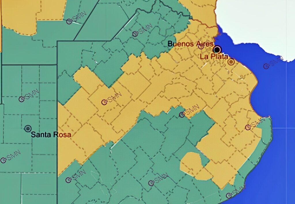 En el caso de Buenos Aires, el área afectada está en alerta amarilla, y abarca una enorme zona que va desde el norte del Conurbano, incluyendo Campana, Exaltación de la Cruz y Zárate, hasta Guaminí, Daireaux y Trenque Lauquen al oeste, y Ayacucho, Balcarce y General Madariaga al sudeste.