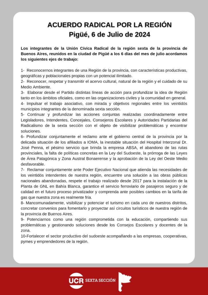 Entre otras cuestiones, el documento de los referentes radicales dde la Sexta llama a “reconocer, respetar y transmitir el acervo cultural, natural de la región y el cuidado de su Medio Ambiente” y “elaborar desde el partido distintas líneas de acción para profundizar la idea de Región”.