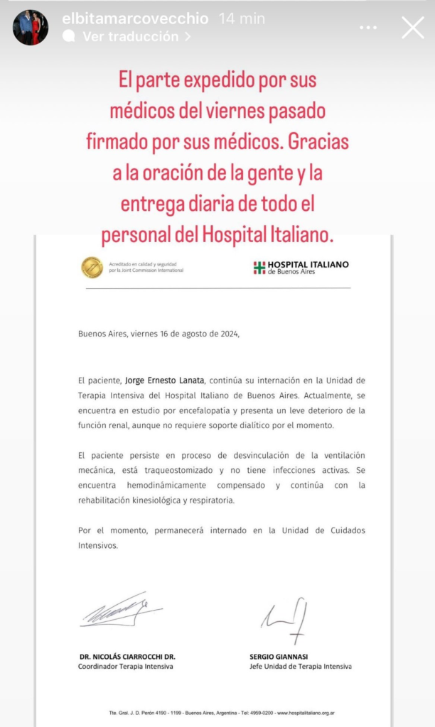 “El paciente, Jorge Ernesto Lanata, continúa su internación en la Unidad de Terapia Intensiva del Hospital Italiano de Buenos Aires. Actualmente, se encuentra en estudio por encefalopatía y presenta un leve deterioro de la función renal, aunque no requiere soporte dialítico por el momento”, indica el comunicado que compartió Marcovecchio.