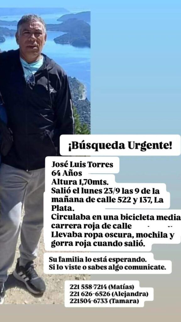 Los familiares y amigos de Jorge están muy preocupados y piden a cualquier persona que haya visto algo o tenga información sobre su paradero que se comunique con las autoridades o con ellos directamente. Quienes tengan información o crean haberlo visto pueden contactarse con Matías al 221 558-7214, con Alejandra al 211 626-6526 o con Tamara al 221 504-6733. (DIB)