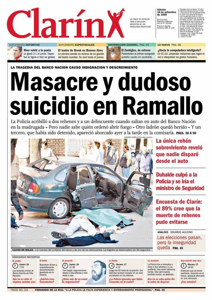 “Hijos de puta, me dieron”, alcanzó a decirle Carlos Chaves, el gerente del Banco Nación de Villa Ramallo a su esposa Flora Lacave, antes de que lo asesinaran. El auto en el que viajaba además el contador Carlos Santillán, era comandado por tres delincuentes que los habían tomado como rehenes y los usaban como escudo para escapar. En plena madrugada del 17 de septiembre de 1999, el Volkswagen Polo sólo alcanzó a recorrer unos pocos metros: fueron 37 segundos y recibió 48 impactos, de los 200 que se dispararon. La denominada “Masacre de Ramallo” fue un baño de realidad para el accionar de la Policía bonaerense y un golpe para el Gobierno de Eduardo Duhalde. Pero además, esa balacera sinsentido permitió descubrir un entramado mucho más perverso detrás de un botín de un banco de un pueblo.