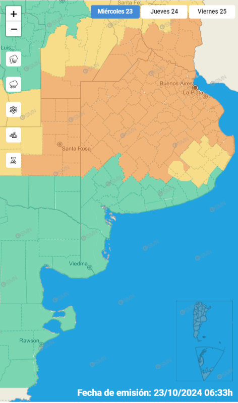 El aviso abarca desde el extremo norte bonaerense, en San Nicolás de los Arroyos, hasta la zona de Olavarría y Laprida, en el sector centro-sur. Abarca el oeste, desde Adolfo Alsina hacia el norte; y en el este, todo el sector del Río de la Plata hasta la costa marítima en el partido de La Costa. En la alerta están incluidos la Ciudad Autónoma de Buenos Aires, el conurbano y La Plata.