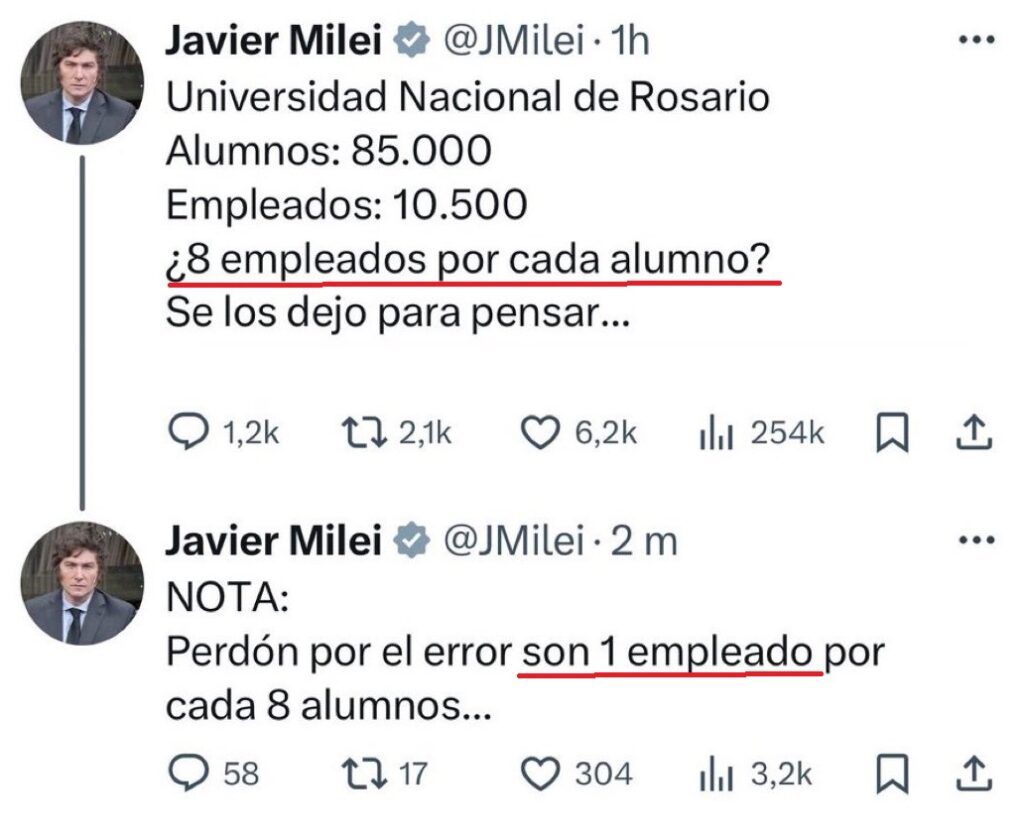En su afán por cuestionar el funcionamiento de las universidades públicas, el presidente Javier Milei criticó en la red social X (ex Twitter) la cantidad de empleados de la Universidad Nacional de Rosario (UNR) pero cometió un doble error: primero matemático y luego, cuando hizo una aclaración, gramatical. Eso le valió fuertes críticas de dirigentes y usuarios.