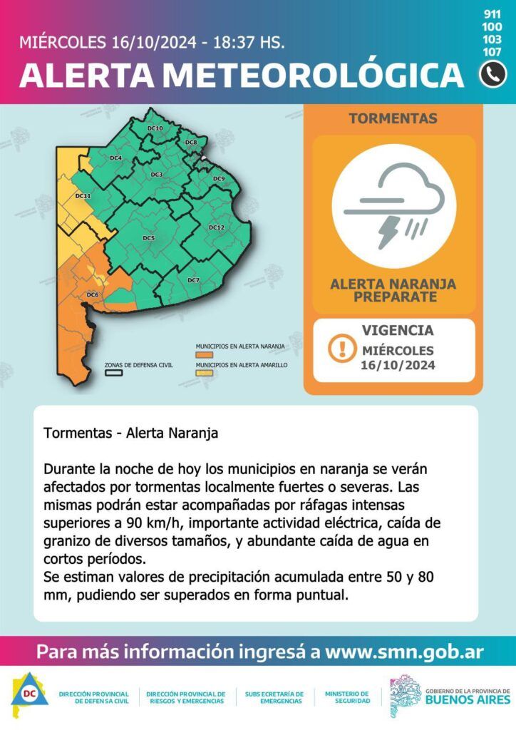 En tanto, el nivel de alerta amarillo para esta noche y madrugada de mañana abarca, por un lado, las zonas serranas de Coronel Pringles, Coronel Suárez, Saavedra y Tornquist, y por otro, Adolfo Alsina, Daireaux, Guaminí, Pellegrini, Salliqueló, Trenque Lauquen, Tres Lomas, Florentino Ameghino, General Villegas y Rivadavia.