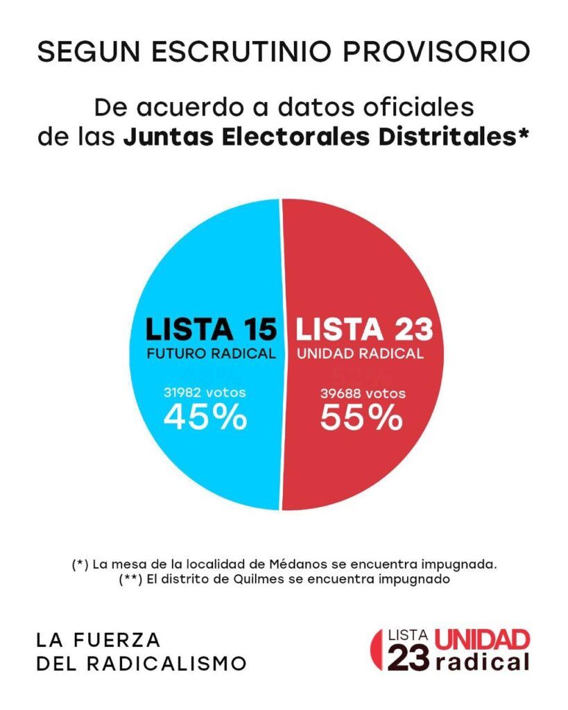 El resultado provisorio arrojó el 55,38% de los votos para la lista “Unidad Radical” para presidir el Comité Provincia, sobre el 44,62% para el sector que llevó como candidato al diputado provincial Pablo Domenichini, quien se apoya en la estructura de Evolución y la figura del senador nacional, Martín Lousteau bajo el nombre “Futuro Radical” y del diputado Facundo Manes.