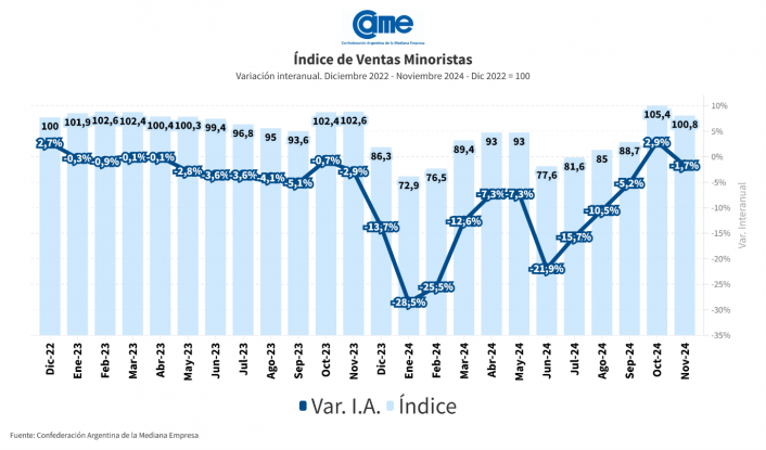 Las ventas minoristas de las pequeñas y medianas empresas cayeron 1,7% interanual en noviembre, a precios constantes, y acumulan un descenso de 12,2% en los primeros once meses de este 2024. En la comparación mensual desestacionalizada, crecieron 3,9%.
