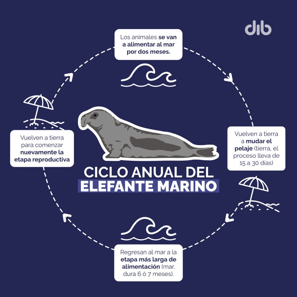 “Finalizada la época reproductiva, los animales se van a alimentar al mar por dos meses, vuelven a tierra a mudar el pelaje, proceso lleva de 15 a 30 días, y regresan al mar a la etapa más larga de alimentación que dura 6 o 7 meses; luego vuelven a tierra para comenzar nuevamente la etapa reproductiva”, explica De León.