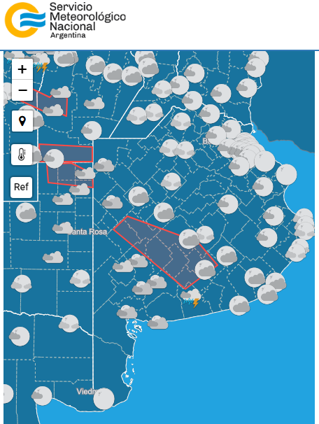 El Servicio Meteorológico Nacional (SMN) emitió un aviso de corto plazo con una duración de tres horas, a las 18 de este jueves, advirtiendo por la ocurrencia de tormentas fuertes con lluvias intensas y ráfagas de viento en los distritos bonaerenses de Adolfo Gonzáles Chaves, Adolfo Alsina, Azul, Benito Juárez, Bolívar, Coronel Suarez, Coronel Pringles, Daireaux, General Lamadrid, Guaminí, Laprida, Olavarría y Tres Arroyos.