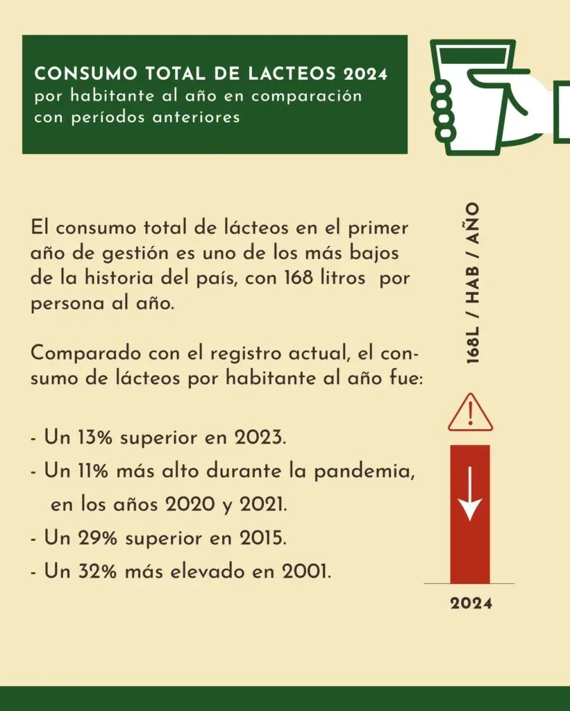 En esos doce meses, el consumo de lácteos cayó 11,2% con respecto al mismo período de 2023, y quedó como uno de los dos más bajos de la historia del país, con 168 litros por persona al año (la FAO recomienda 182 litros), apenas por encima de lo consumido durante la crisis de 1990 (162 litros). De hecho, el consumo en 2001, año crítico para el país, era un 32% superior al valor actual (con 222 litros), en 2015 un 29% más (217 litros) y en 2020, primer año de pandemia, un 8.3% por encima.