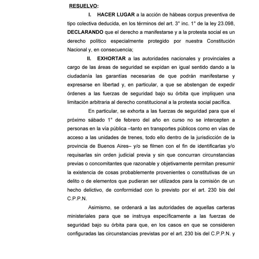 De esta manera, el magistrado exhortó a las autoridades nacionales y provinciales a cargo de las áreas de seguridad a que “den a la ciudadanía las garantías necesarias de que podrán manifestarse y expresar en libertad y, en particular, a que se abstengan de expedir órdenes a las fuerzas de seguridad bajo su órbita que impliquen una limitación arbitraria al derecho constitucional a la protesta social pacífica”.