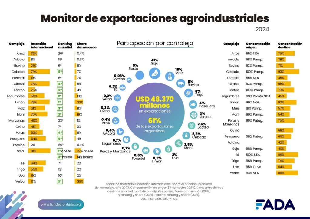 Las exportaciones agroindustriales crecieron un 25% durante 2024 frente al año previo y alcanzaron un superávit comercial de US$ 39.000 millones, según el Monitor de Exportaciones elaborado por la Fundación Agropecuaria para el Desarrollo de Argentina (FADA).