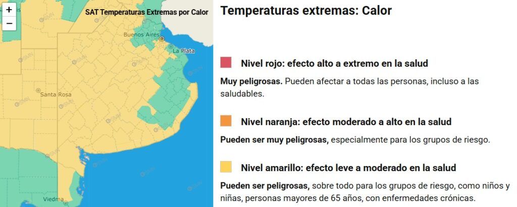 La alerta térmica de nivel amarillo implica un “efecto leve a moderado en la salud”, según el Servicio Meteorológico Nacional. Estas temperaturas elevadas “pueden ser peligrosas, sobre todo para los grupos de riesgo, como niños y niñas, personas mayores de 65 años, con enfermedades crónicas”.