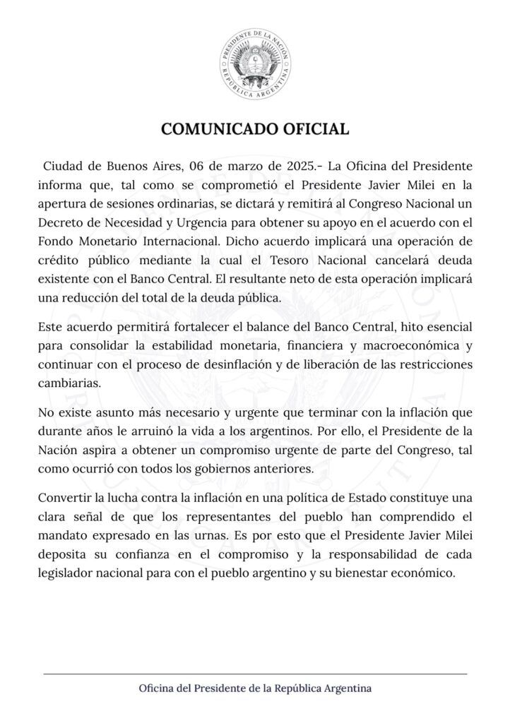 “La Oficina del Presidente informa que, tal como se comprometió el presidente Javier Milei en la apertura de sesiones ordinarias, se dictará y remitirá al Congreso Nacional un Decreto de Necesidad y Urgencia para obtener su apoyo en el acuerdo con el Fondo Monetario Internacional”, se publicó esta noche en la red social X, el canal elegido por el Gobierno para la difusión de la información oficial.