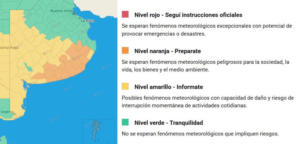 El resto del oeste y el sur bonaerense, desde Ameghino hasta Patagones, incluyendo Azul, Olavarría y Tandil, permanece bajo alerta amarilla.