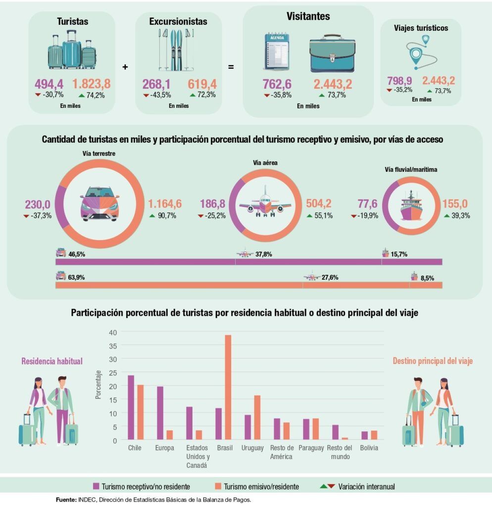 En tanto, el 86,2% del turismo emisivo se dirigió a los países limítrofes. Los principales destinos fueron Brasil, con 38,6%; Chile, con 20,2%; y Uruguay, con 16,3%. Mientras que el 23,7% del turismo receptivo reside en Chile; el 19,6% en Europa; y el 12,1% en “Estados Unidos y Canadá”. (DIB)