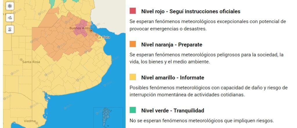 De acuerdo con el último informe del Servicio Meteorológico Nacional (SMN) emitido a las 5.47 de este sábado, se encuentran en alerta roja por la tormenta los partidos de Zárate, Campana, San Antonio de Areco, Exaltación de la Cruz, San Andrés de Giles, Luján, Mercedes, Moreno, Marcos Paz, General Las Heras y Suipacha. En todos estos distritos, que fueron los más afectados durante el viernes, se espera para la presente jornada El área será afectada por lluvias y tormentas severas. “abundante caída de agua en cortos períodos, ráfagas y actividad eléctrica, y se prevén valores de precipitación acumulada entre 60 y 100 mm”. Para la tarde el nivel de alerta se prevé amarillo, y baja la cantidad de lluvia esperada.
