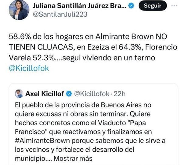 Y Santillán lo cruzó: “58.6% de los hogares en Almirante Brown NO TIENEN CLUACAS, en Ezeiza el 64.3%, Florencio Varela 52.3%….segui viviendo en un termo”. La diputada, sin embargo, cometió un grave error ortográfico que en las redes sociales no se lo dejaron pasar: puso cluaca en vez de cloaca. (DIB)