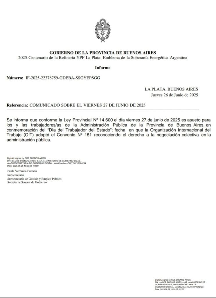 Y en una circular que circula este jueves, firmada por la subsecretaria de Gestión y Empleo Público bonaerense, Paula Verónica Ferraris, se comunica que “conforme la Ley Provincial N° 14.600 el día viernes 27 de junio de 2025 es asueto para los y las trabajadores/as de la Administración Pública de la Provincia de Buenos Aires, en conmemoración del ‘Día del Trabajador del Estado’; fecha en que la Organización Internacional del Trabajo (OIT) adoptó el Convenio N° 151 reconociendo el derecho a la negociación colectiva en la administración pública”.