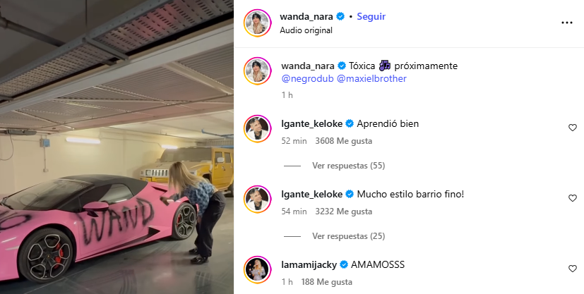 Garaje, Lamborghini pintado de rosa (inconfundible). De fondo, música electrónica de punch grave. Wanda Nara entra en cuadro y, aerosol en mano, pinta el coche con trazo firme. “Tóxica”, escribe, y se escucha un coro que repite la misma palabra. Con este breve video, la mediática y empresaria presentó su próximo hit en redes sociales y, en pocos segundos levantó polvareda y likes.