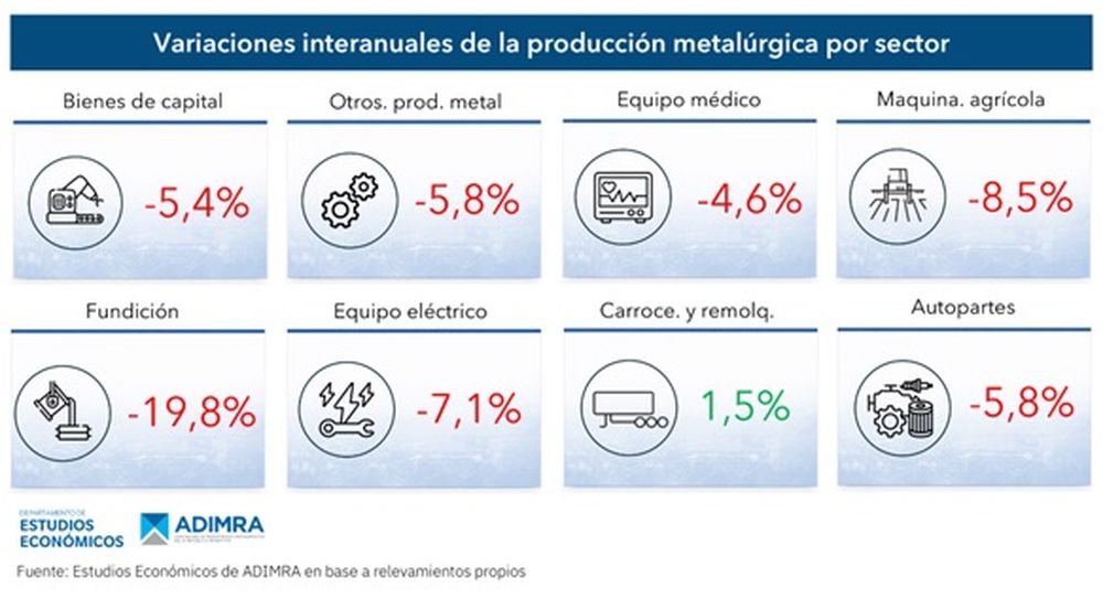 El resto del entramado metalúrgico se mantuvo en retroceso: Fundición (-19,8%), Equipo Eléctrico (-7,1%), Autopartes (-5,8%), Bienes de Capital (-5,4%), Otros Productos de Metal (-5,8%) y Equipamiento Médico (-2,8%) registraron caídas interanuales persistentes, destacándose nuevamente Fundición como el sector más afectado.