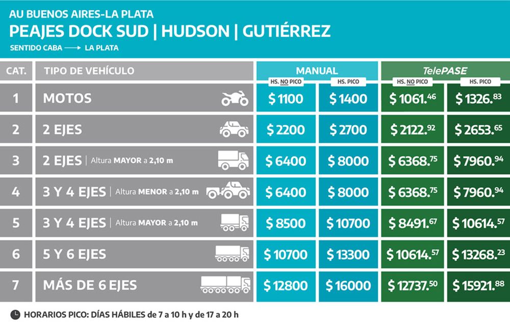 El recorrido desde la Capital Federal hacia Mar del Plata implica el paso por cuatro cabinas de peaje. Primero, los de Dock Sud y Hudson, sobre la autopista Buenos Aires–La Plata. Luego, ya sobre la Ruta 2, se suman los peajes de Samborombón y Maipú. Cada uno de estos últimos costará actualmente $7000, mientras que los primeros dos suman en conjunto $4.400, siempre en hora pico.