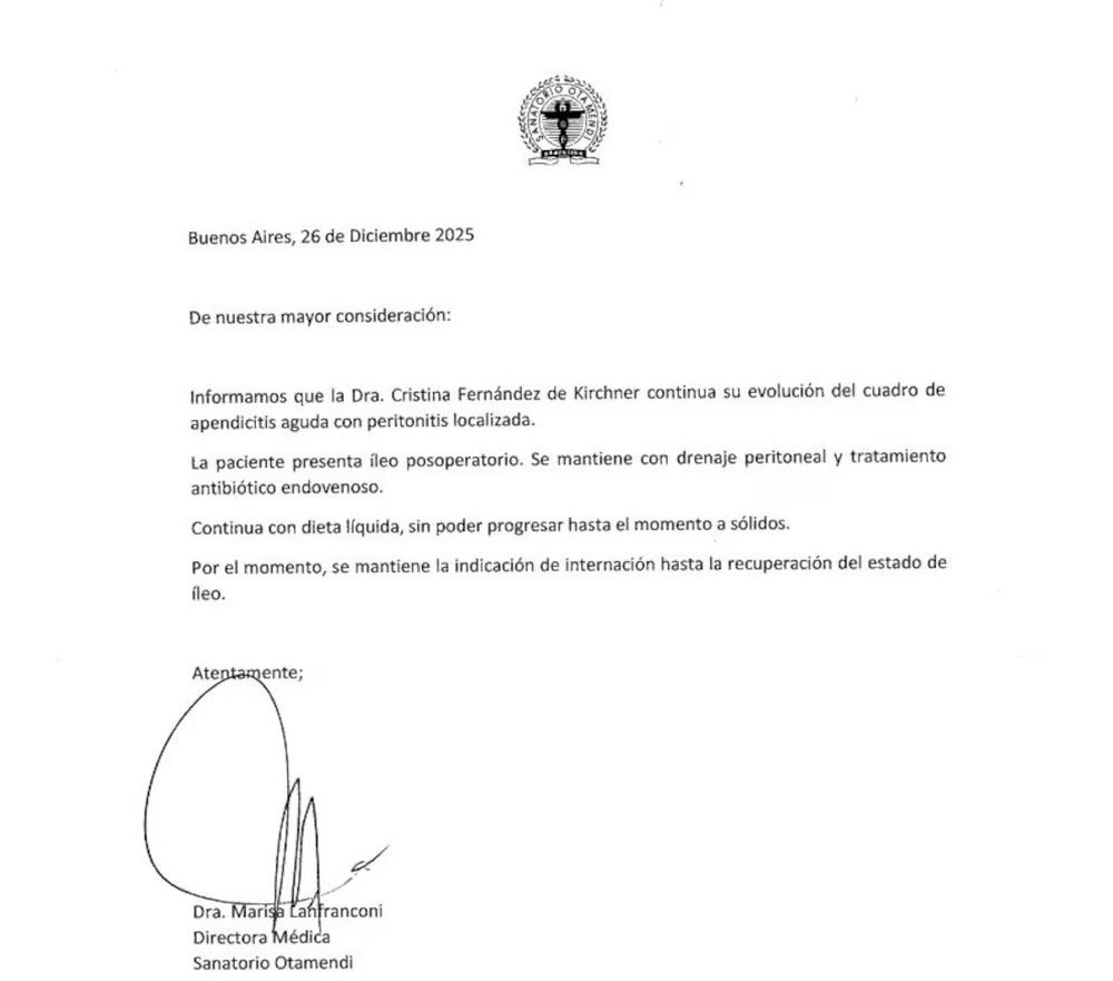 “Informamos que la Dra. Cristina Fernández de Kirchner continua su evolución del cuadro de apendicitis aguda con peritonitis localizada. La paciente presenta íleo posoperatorio. Se mantiene con drenaje peritoneal y tratamiento antibiótico endovenoso”, detallaron en el parte.