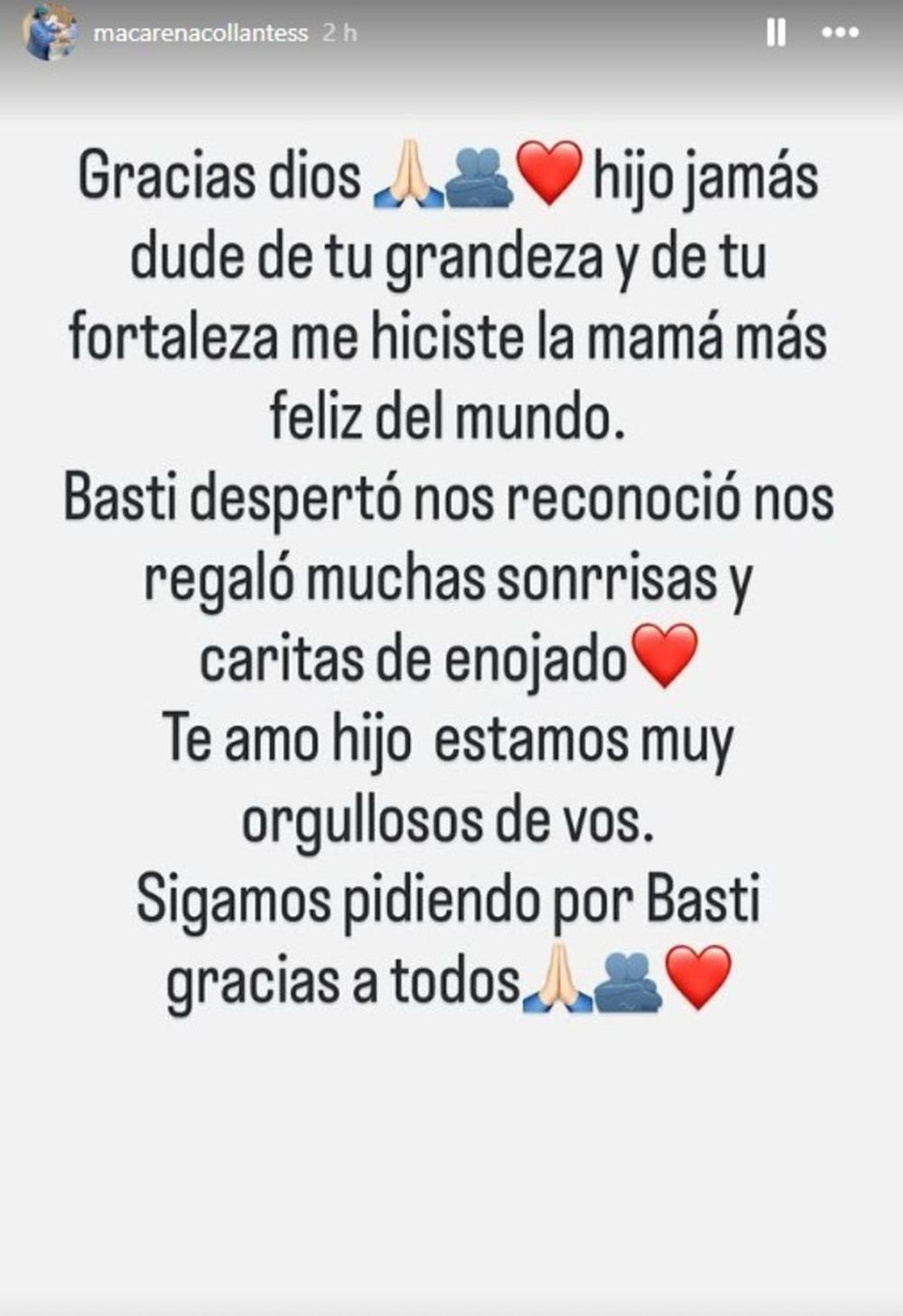 “Gracias, Dios. Hijo, jamás dudé de tu grandeza y fortaleza -expresó en sus redes sociales-. Me hiciste la mamá más feliz del mundo. Te amo, estamos muy orgullosos de vos. Nos regaló muchas sonrisas y caritas de enojado. Te amo hijo estoma muy orgullosos de vos. Sigamos pidiendo por Basti. Gracias a todos”.