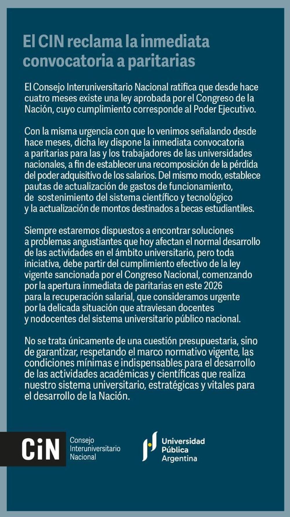 Según afirma el Consejo Interuniversitario Nacional, “siempre estaremos dispuestos a encontrar soluciones a problemas angustiantes que hoy afectan el normal desarrollo de las actividades en el ámbito universitario, pero toda iniciativa debe partir del cumplimiento efectivo de la ley vigente sancionada por el Congreso Nacional, comenzando por la apertura inmediata de paritarias en este 2026 para la recuperación salarial, que consideramos urgente por la delicada situación que atraviesan docentes y nodocentes del sistema universitario público nacional”.